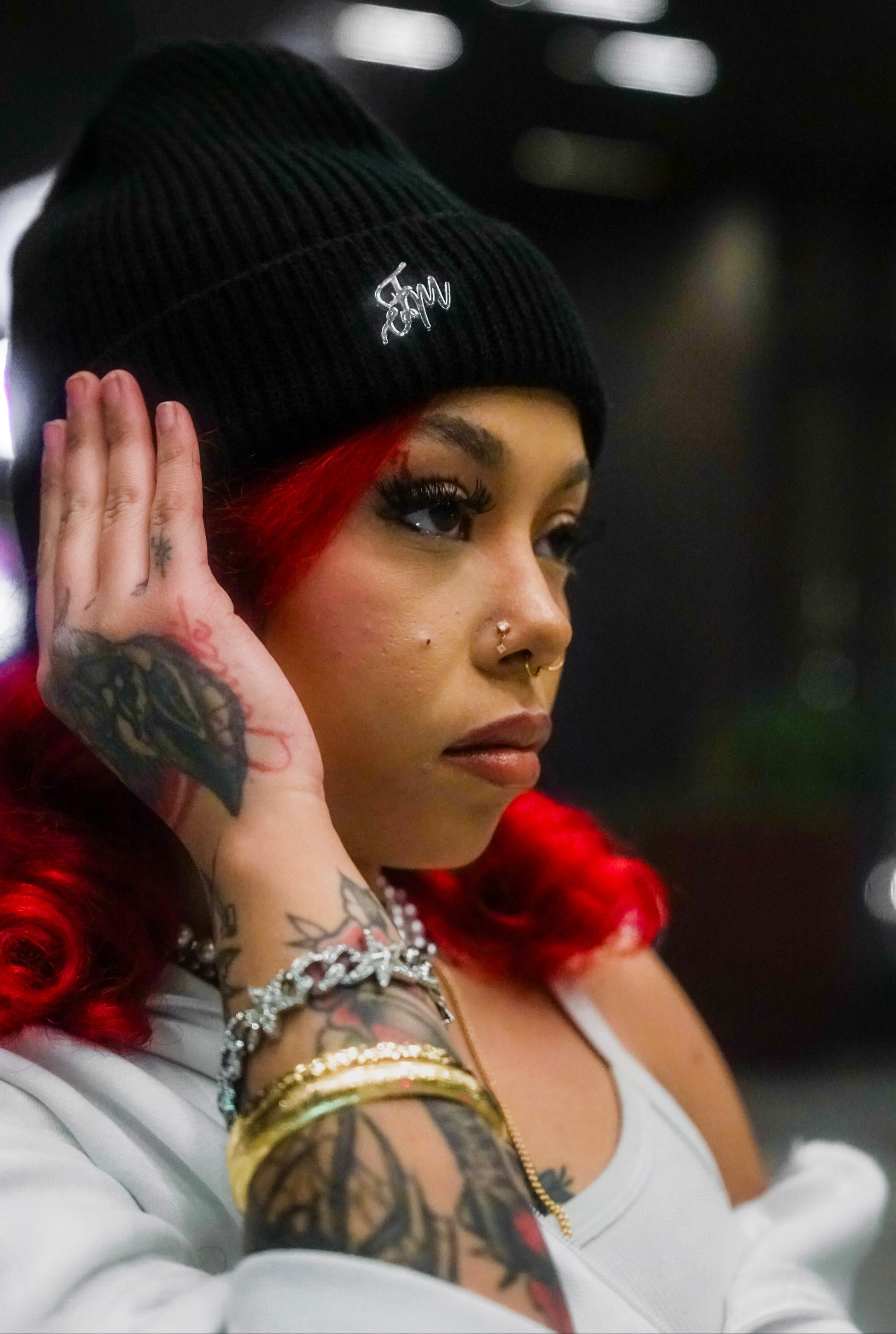 The Focused Motions beanie comes in bold colors and is perfect for cold weather. It’s made from soft 100% cashmere with a ribbed knit design and a smooth satin lining inside to protect your hair. The beanie has a folded cuff with a silver gold FM logo for a clean, stylish look.